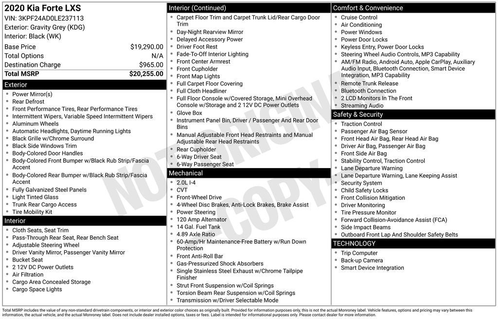 2020 Kia Forte LXS 2.0L 4-Cylinder MPI Gravity Gray