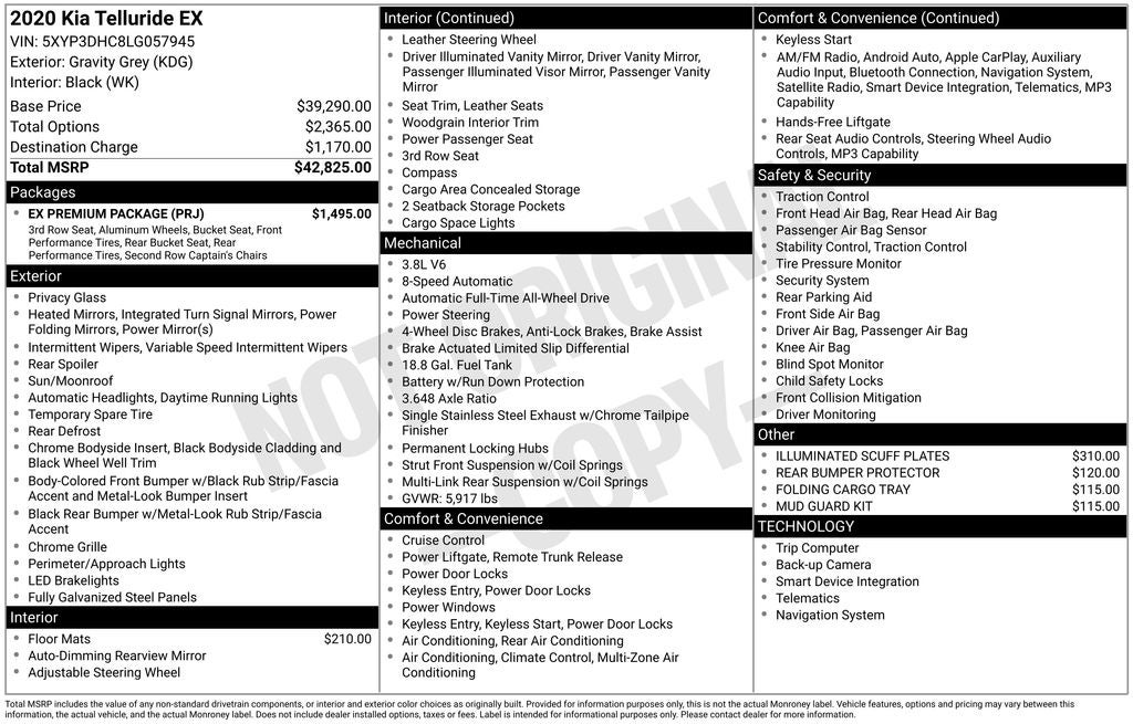 2020 Kia Telluride EX 3.8L V6 DGI DOHC Dual CVVT Gravity Gray