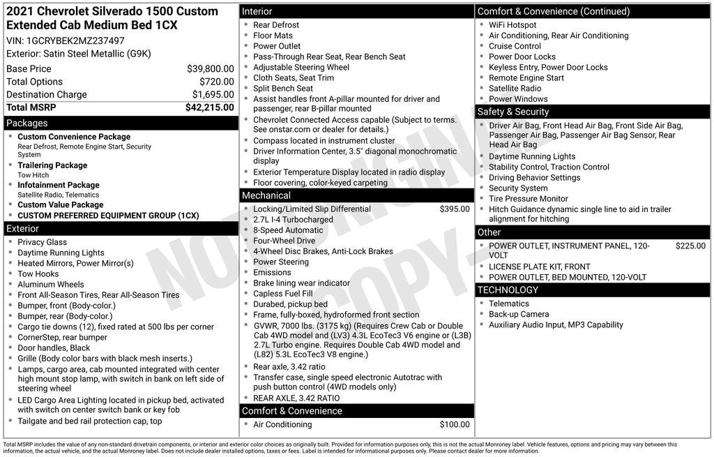 - Custom Value Package includes (PCX) Custom Convenience Package, (ZLA) Infotainment Package and (Z82) Trailering Package
