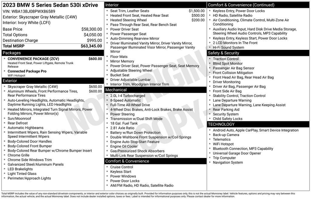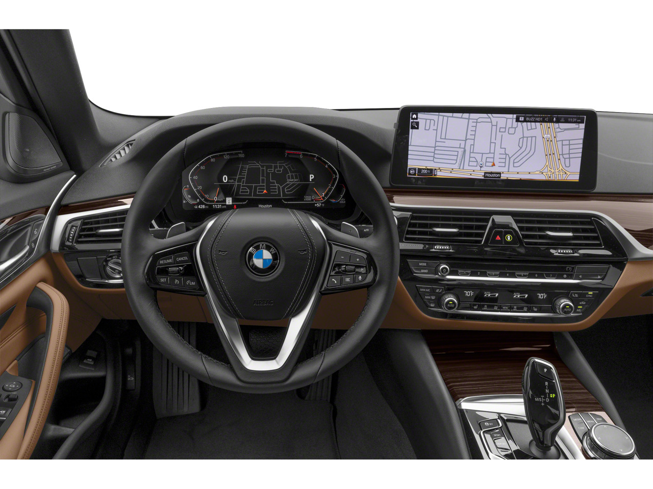 The interior of this 5 Series is a true sanctuary, with premium features such as a panoramic moonroof, a premium sound system, and a state-of-the-art infotainment system with navigation, Apple CarPlay, and Android Auto. The Convenience Package adds even more luxury, including a power tailgate and heated front seats.