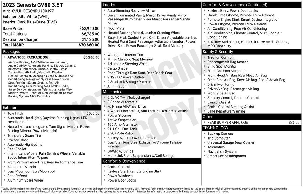 The exterior of this GV80 is finished in a stunning White color, giving it a sleek and sophisticated appearance. Step inside, and you'll be greeted by a spacious and well-appointed cabin that showcases Genesis' commitment to craftsmanship and attention to detail. The Advanced Package equips this GV80 with a wealth of premium features, including a premium Lexicon audio system, 3-zone climate control, heated second-row seats, a head-up display, and much more.