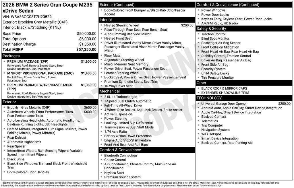 The M Sport Professional Package and Premium Package elevate this M235i to new heights, offering a host of advanced features that cater to the discerning driver. From the increased top speed limiter and launch control to the heated steering wheel and panoramic moonroof, this BMW is designed to exceed your expectations.