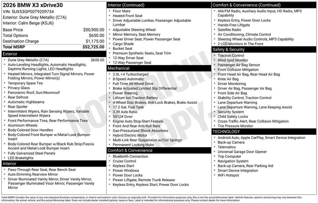 The Convenience Package adds a host of premium features, including a panoramic moonroof, remote engine start, and a heated steering wheel, elevating the driving experience. Inside, the spacious and well-appointed cabin showcases BMW's renowned craftsmanship, with luxurious Veganza upholstery, a premium sound system, and cutting-edge technology like wireless device charging and the latest BMW Maps navigation system.