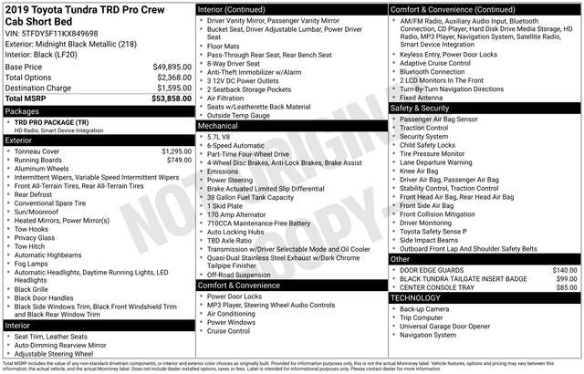 Odometer is 37752 miles below market average! 2019 Toyota Tundra TRD Pro 5.7L 8-Cylinder SMPI DOHC Midnight Black Metallic